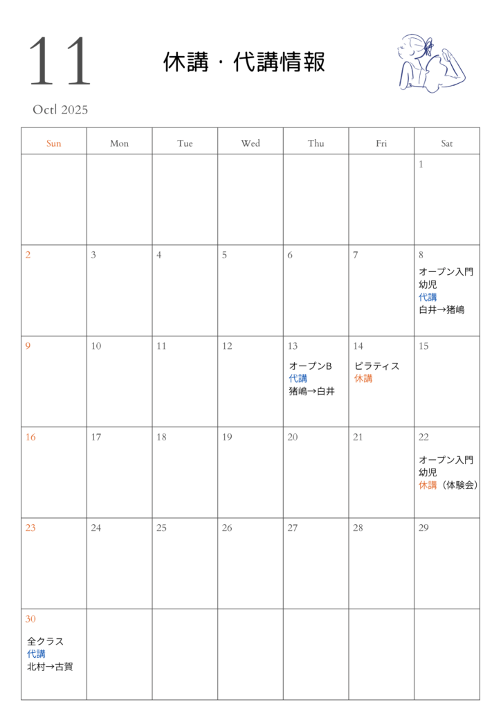 Newsニュース 2025/10/30 【所沢校】11月休講・代講情報 所沢駅前校11月の休講・代講情報です。 11月8(土) オープン入門、幼児 代講 白井先生 → 猪嶋先生 11月13日(木) オープンB 代講 猪嶋先生 → 白井先生 11月14日(金) ピラティス 休講 11月22日(土) オープン入門 休講 幼児 休講 11月30日(日) 幼児、初級Ⅰ①②、オープンA 代講 北村先生 → 古賀先生 一覧へ戻る